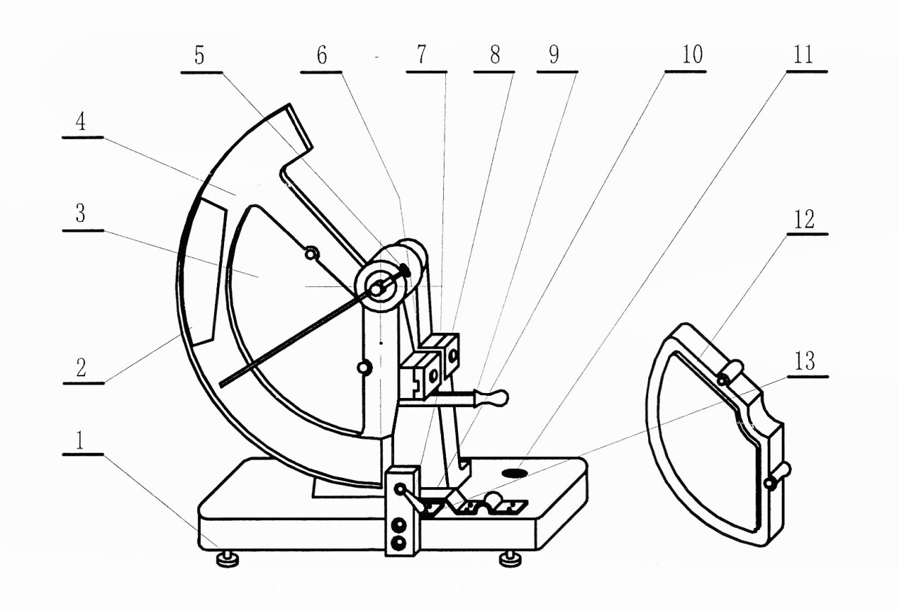 儀器由機(jī)座、支承座及扇形錘等零部件組成。矩形試樣夾緊于動(dòng)夾鉗(6)與固定夾鉗(7)之間,試樣中間由撕裂刀(9)切開一個(gè)切口,利用扇形錘(4)下落,動(dòng)夾鉗(6)和固定夾鉗(7)迅速分離,使試樣受到撕裂。